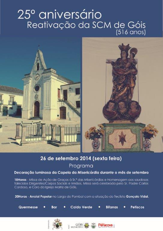 Inserido nas comemorações das bodas de prata da reactivação da Santa Casa da Misericórdia de Góis, além da decoração luminosa da capela da instituição que poderá ser vista durante este mês de Setembro, no próximo dia 26, pelas 18 horas, vai ser celebrada missa de acção de graças e em honra de Nossa Senhora das Misericórdias, que será abrilhantada pelo coro da igreja matriz, seguindo-se um arraial popular no Largo do Pombal, com a actuação do teclista Gonçalo Vidal.