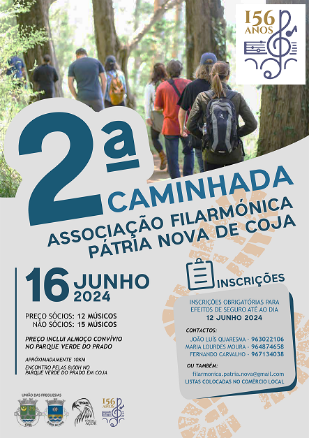 Mais um motivo de encontro e convívio entre cojenses e amigos, a Caminhada, com aproximadamente 10 quilómetros, tem início pelas 8 horas, no Parque Verde do Prado onde será o encontro entre todos os participantes, que podem fazer as inscrições (obrigatórias) até ao dia 12, através dos contactos: João Luís Quaresma, 963022106; Maria de Lourdes Moura, 964874658; Fernando Carvalho , 967134038, ou também filsrmonica.patria.nova@gmail.com ou nas listas colocadas no comércio local.