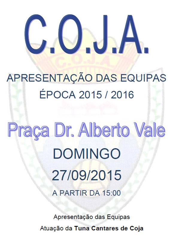 O Clube Operário Jardim do Alva (C.O.J.A.), apresenta no domingo, a partir das 15 horas, na Praça Dr. Alberto Vale, aos sócios, adeptos, simpatizantes e comunidade, as equipas de futebol que irão disputar os diversos campeonatos da Associação de Futebol de Coimbra.