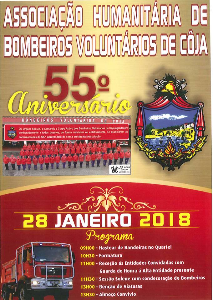 O Secretário de Estado da Protecção Civil, José Artur Tavares Neves, preside à cerimónia comemorativa do 55.º Aniversário da Associação Humanitária dos Bombeiros Voluntários de Coja, que tem lugar amanhã, domingo, dia 28, a partir das 11 horas, no Quartel dos Bombeiros Voluntários.