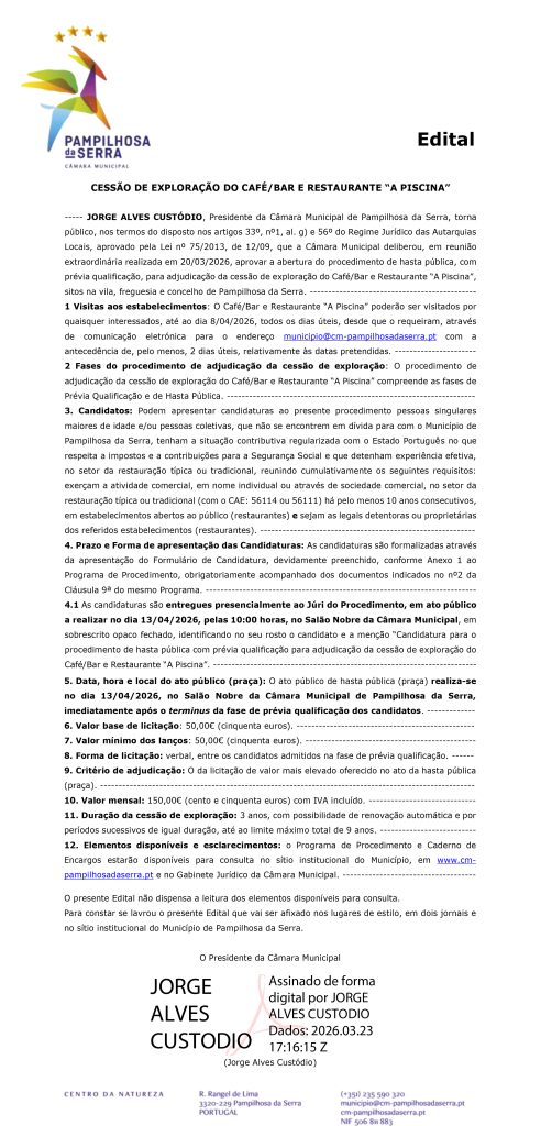 EDITAL – Câmara Municipal de Pampilhosa da Serra