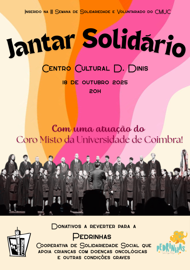 Inserido na nossa III Semana da Solidariedade e Voluntariado) a reverter para a Pedrinhas, cooperativa sem fins lucrativos que apoia crianças com doenças oncológicas ou outras condições graves, o Jantar/ Atuação Solidária tem lugar no dia 18 de Outubro, sábado, às 20 horas, no Centro Cultural D. Dinis, aberto a todos os que se quiserem associar a esta feliz iniciativa e contará com uma atuação do Coro Misto da Universidade de Coimbra.