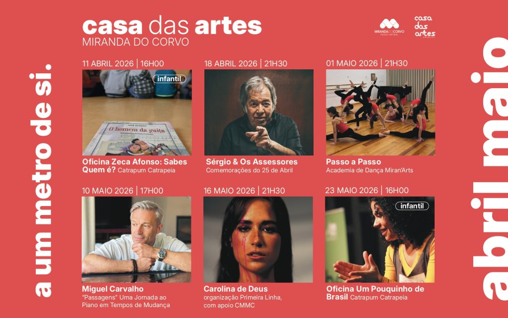 A vitalidade cultural prossegue em Maio com uma forte componente artística e pedagógica. No dia 1, a Academia de Dança Miran’Artes apresenta o espetáculo “Passo a Passo”, seguindo-se, a 10 de Maio, a sonoridade intimista do pianista Miguel Carvalho com o projeto “Passagens”.