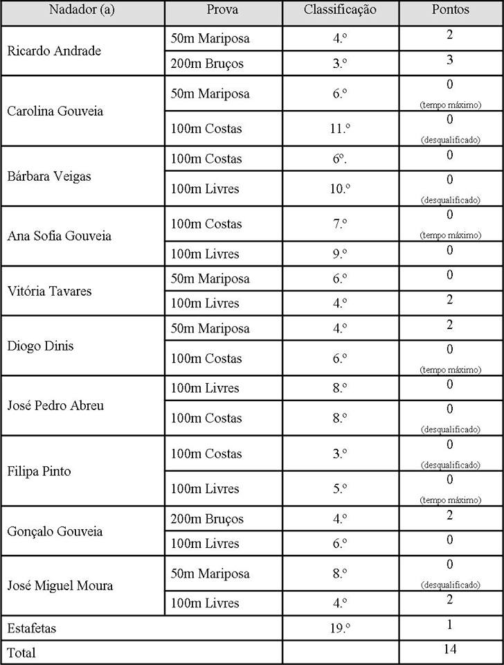O nadador Ricardo Andrade voltou a ser o mais pontuado da EMNT (5 pontos), tendo os nadadores José Miguel Moura, Gonçalo Gouveia, Diogo Dinis e Vitória Tavares também contribuído para os 14 pontos amealhados nesta jornada. (tabela classificativa em anexo).