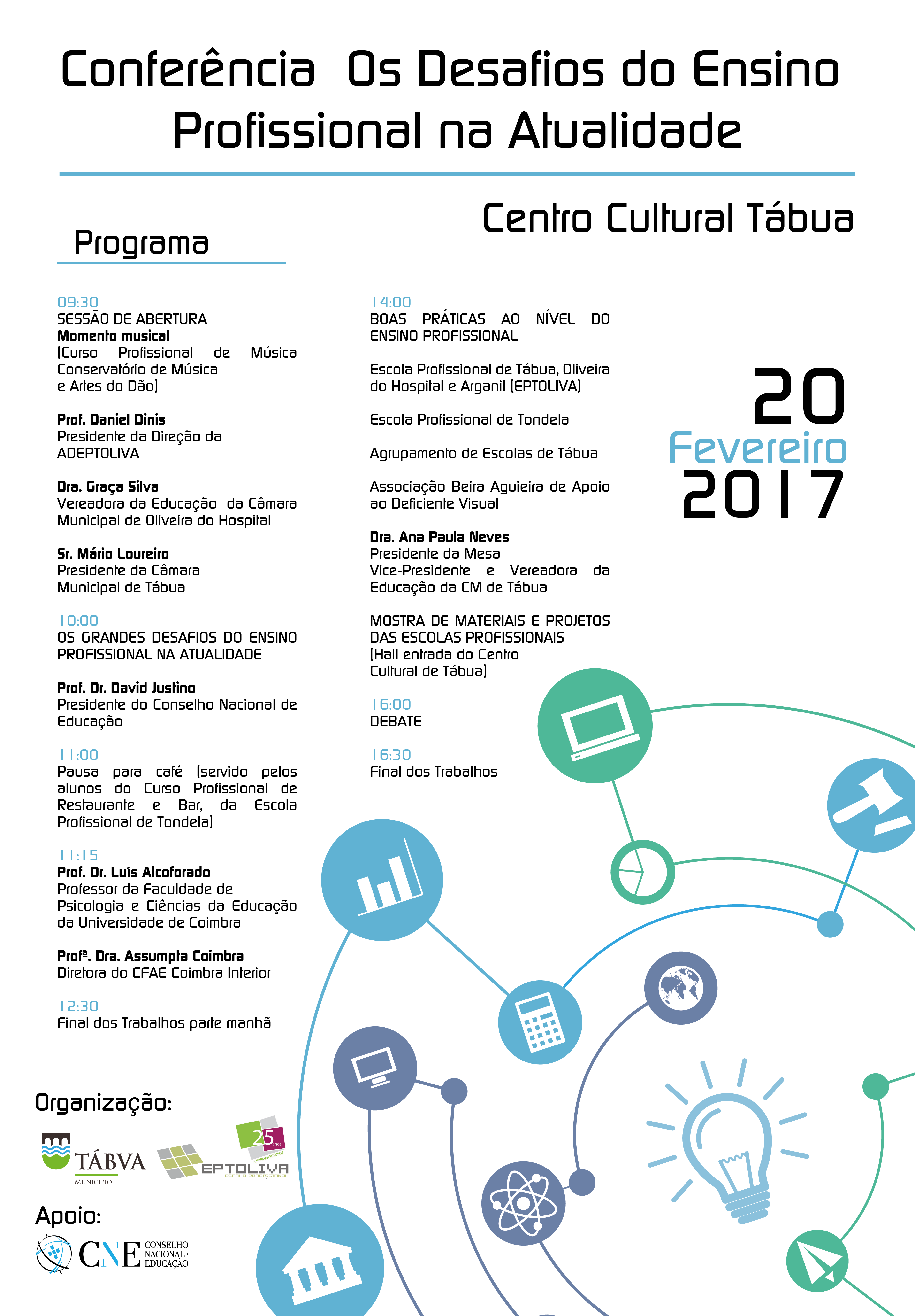 Durante o dia serão abordadas as temáticas “Os Desafios do Ensino Profissional na Actualidade” e “Boas Práticas ao Nível do Ensino Profissional”, com a intervenção de vários oradores convidados, terminando a conferência com a intervenção da Presidente de Mesa, vice-presidente e vereadora da Educação da Câmara Municipal de Tábua, Ana Paula Neves.